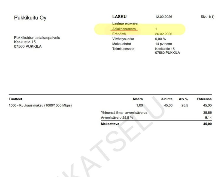 Pukkikuitu lähettää kaikille asiakkaille asiakasnumeron tekstiviestillä. Asiakasnumero löytyy myös aikaisemmista laskuista, laskun oikeassa yläkulmassa. Esimerkkikuva alla.